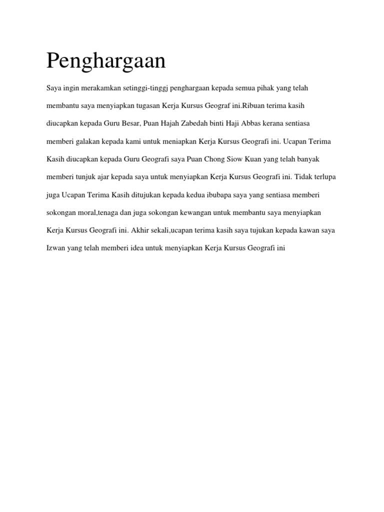 Contoh Penghargaan Kerja Lapangan Geografi Tingkatan 3 - Pendahuluan Kerja Kursus Geografi Tingkatan 1 Andri. Isi kandungan penghargaan pendahuluan objektif kajian kawasan kajian link untuk penulisan laporan lengkap siri akhir sehingga siap. Setinggi tinggi penghargaan kepada Pengetua SMK Jalan Bukit Puan Roslina binti Che Omar kerana memberi kebenaran untuk menjalankan kerja lapangan ini.